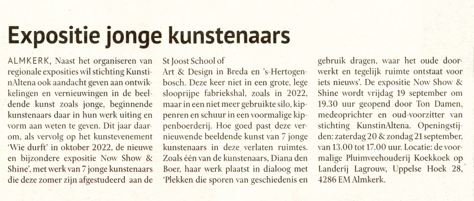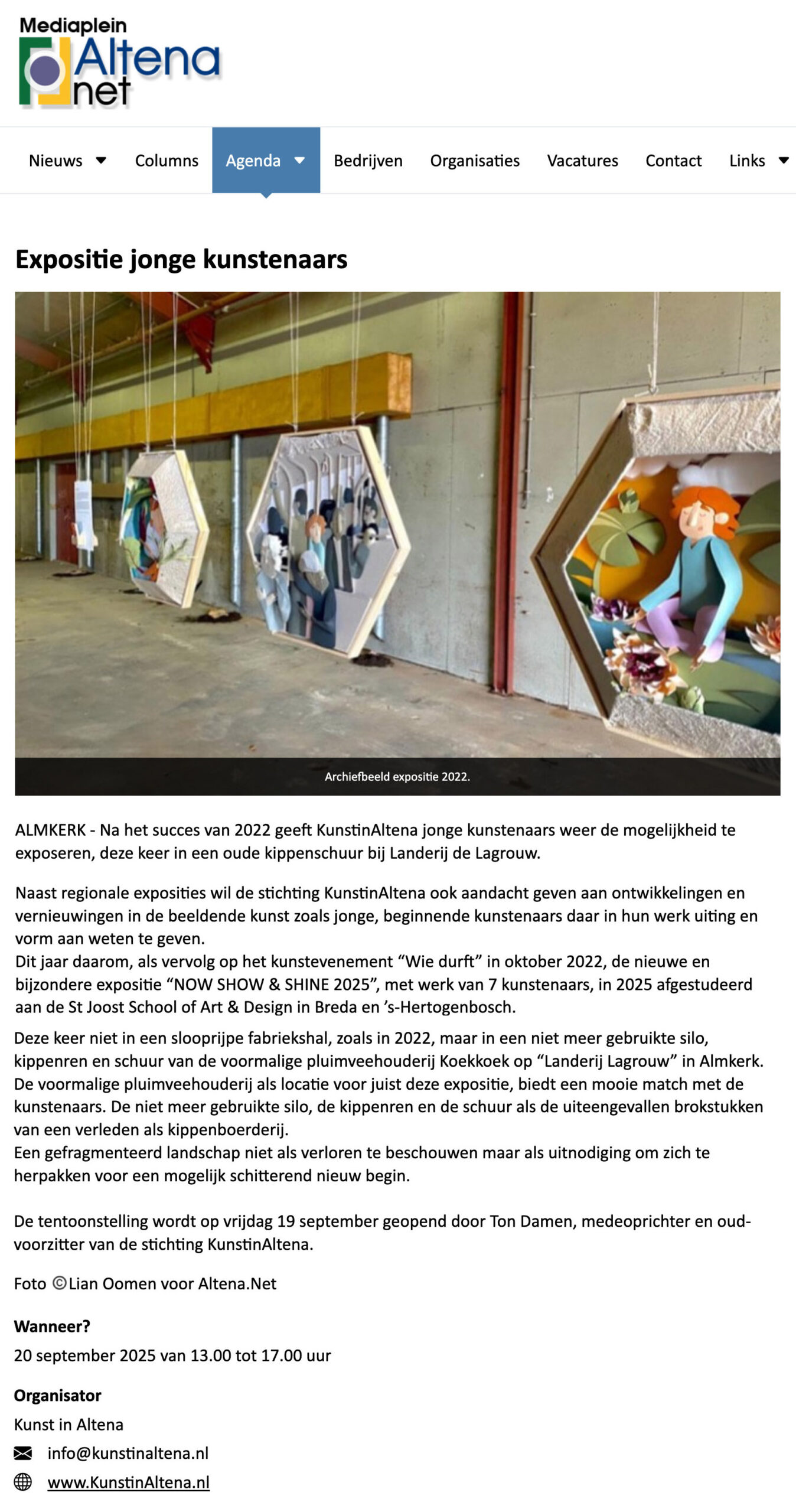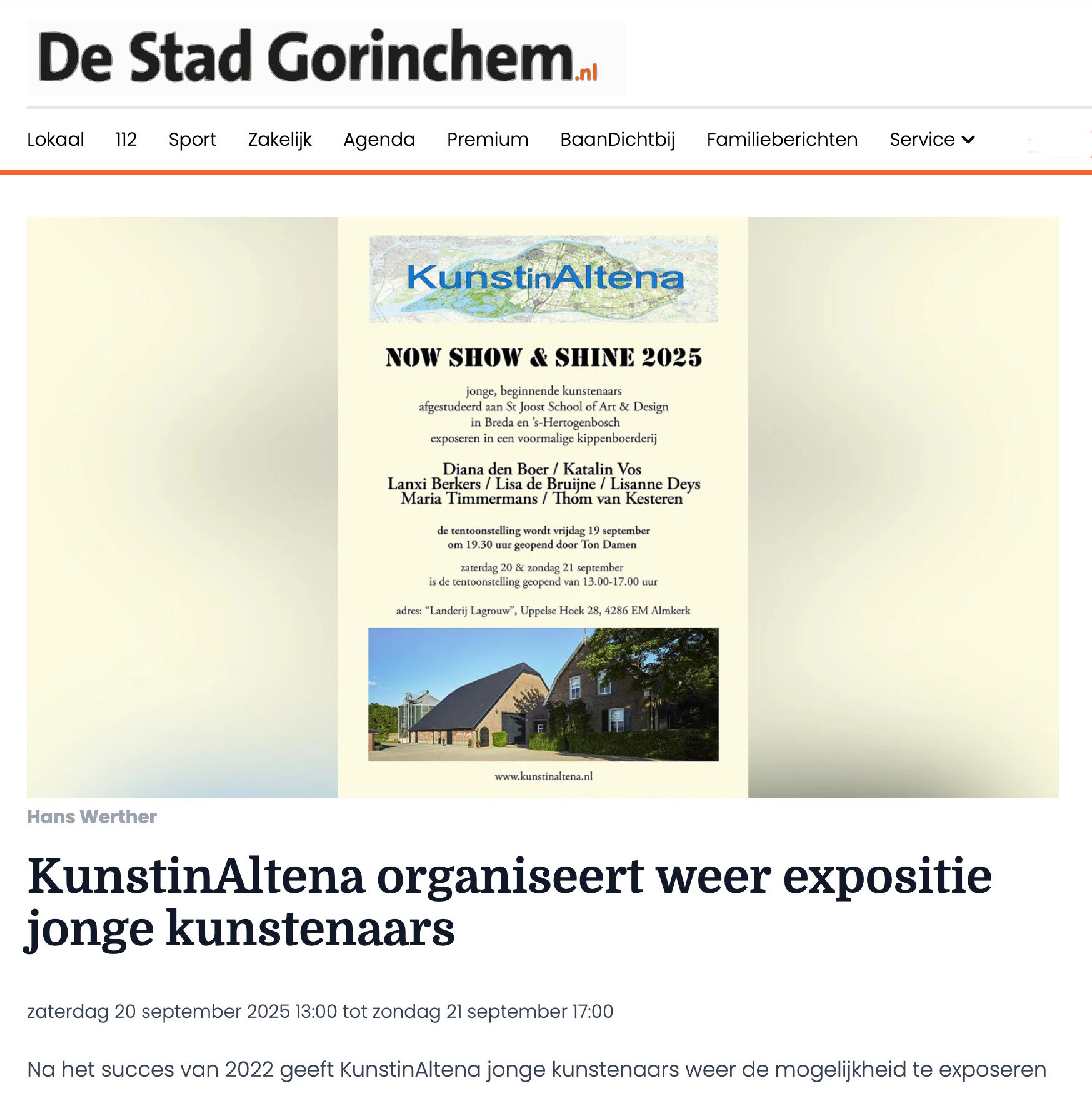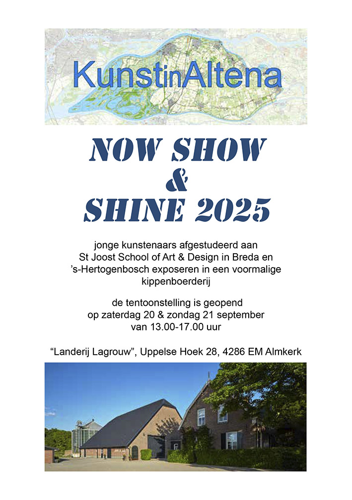 Dit jaar daarom, als vervolg op het kunstevenement “Wie durft” in oktober 2022, de nieuwe en bijzondere expositie “NOW SHOW & SHINE 2025”, met werk van 7 kunstenaars, in 2025 afgestudeerd aan de St Joost School of Art & Design in Breda en ’s-Hertogenbosch.