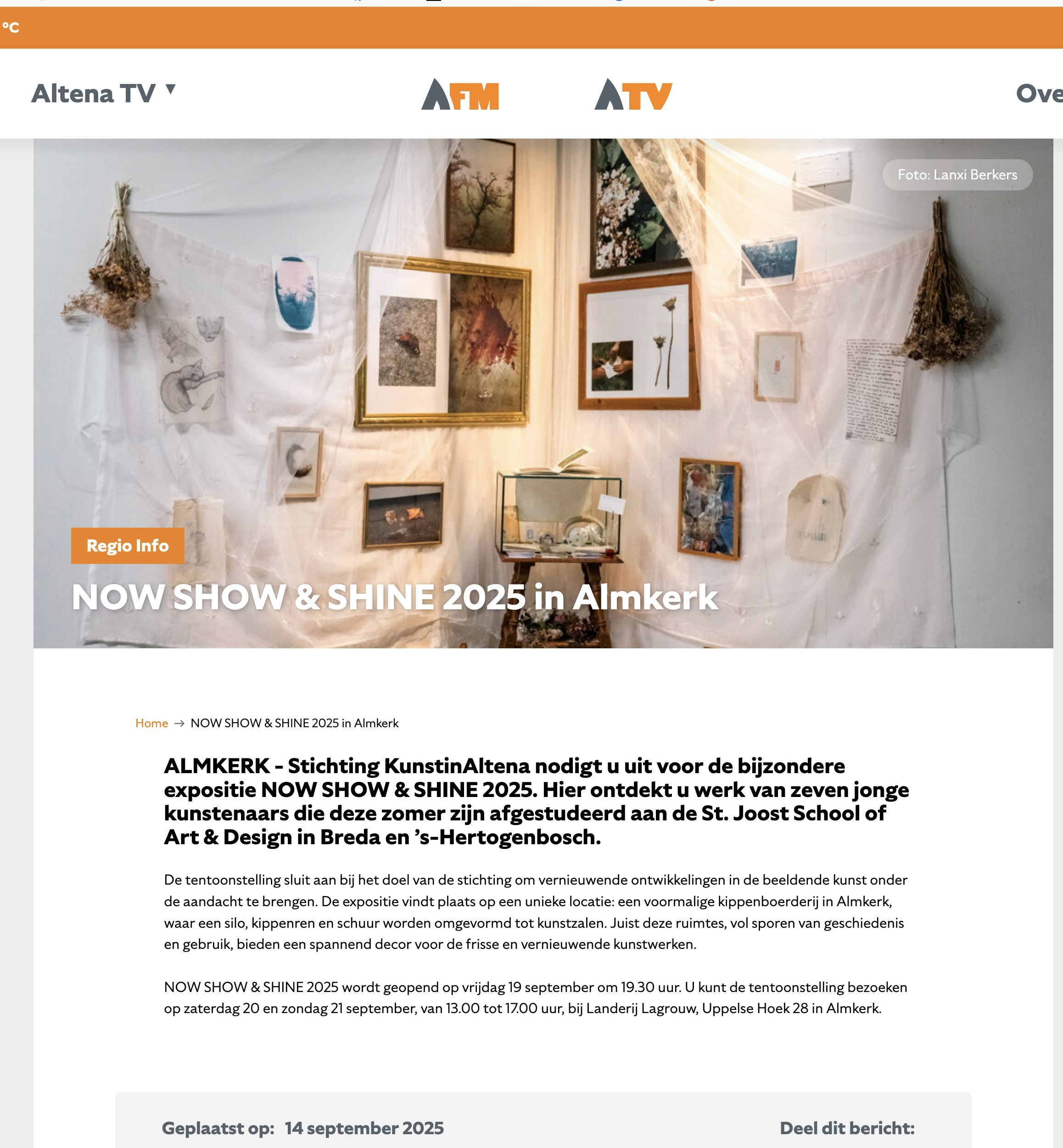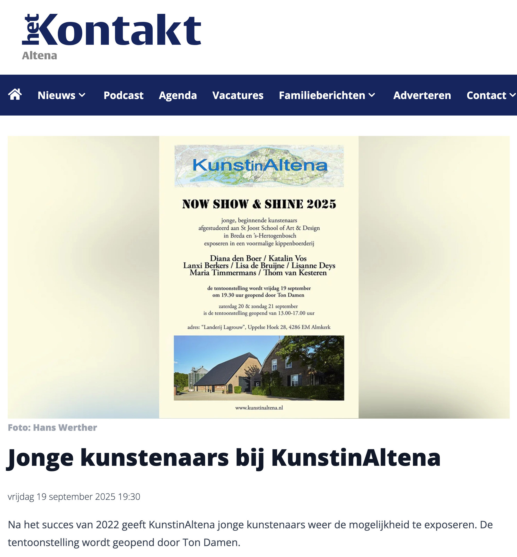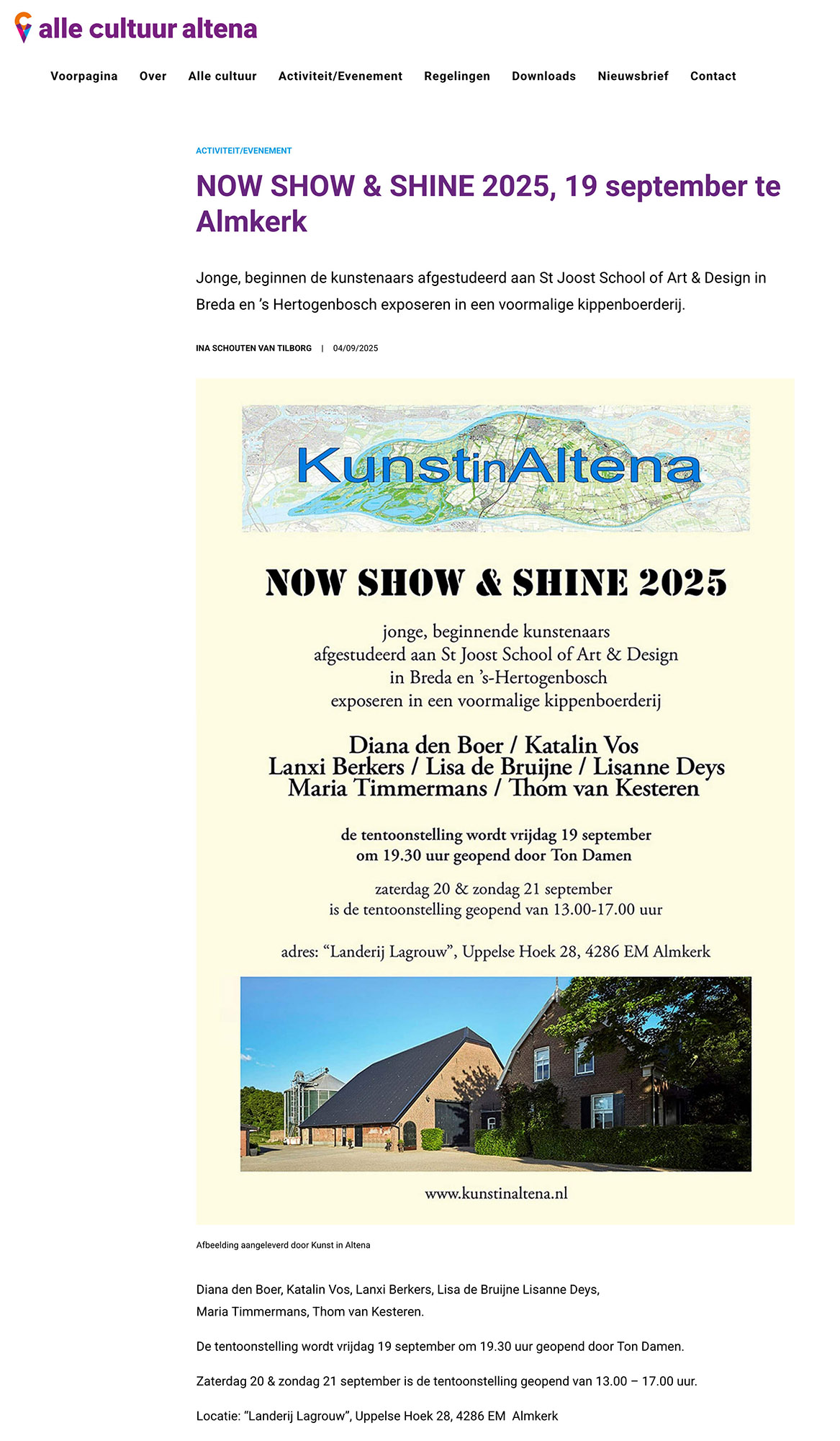 Dit jaar daarom, als vervolg op het kunstevenement “Wie durft” in oktober 2022, de nieuwe en bijzondere expositie “NOW SHOW & SHINE 2025”, met werk van 7 kunstenaars, in 2025 afgestudeerd aan de St Joost School of Art & Design in Breda en ’s-Hertogenbosch.