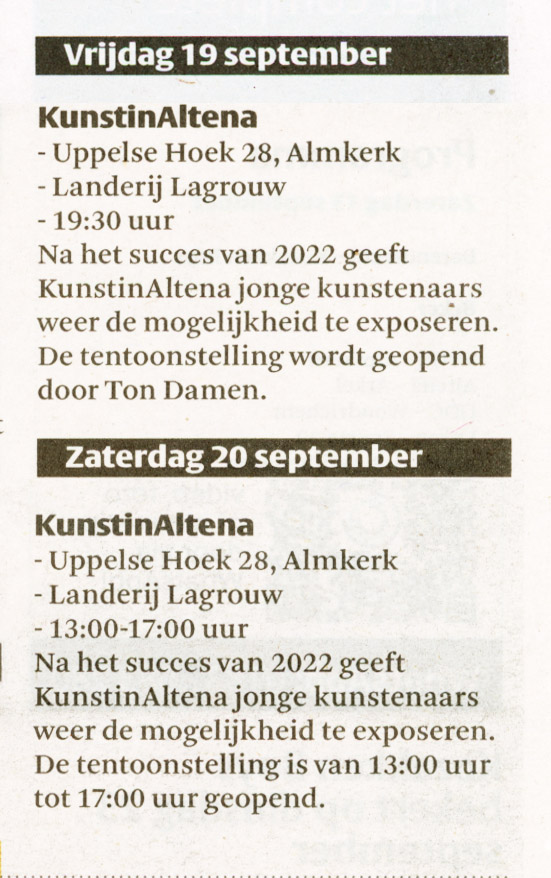 De tentoonstelling is op vrijdag 19 september geopend door Ton Damen, medeoprichter en oud-voorzitter van de stichting KunstinAltena. Tekst opening expositie