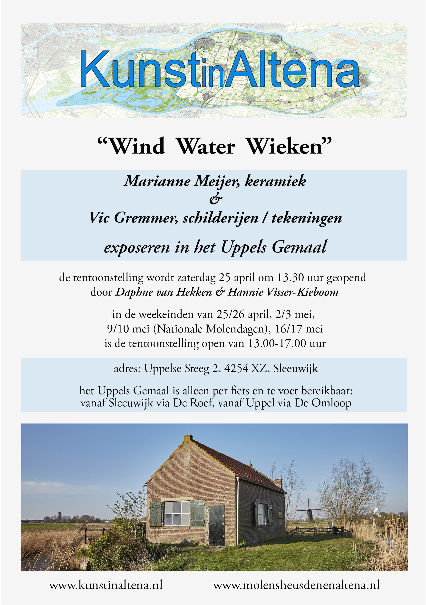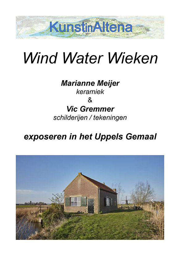 Gedurende vier weekenden van 25 april tot en met 17 mei 2026 organiseert de Stichting KunstinAltena in deze ruimte een duo-expositie van Marianne Meijer en Vic Gremmer. Beiden zijn geboeid door de unieke plek en omgeving van het Uppels Gemaal.