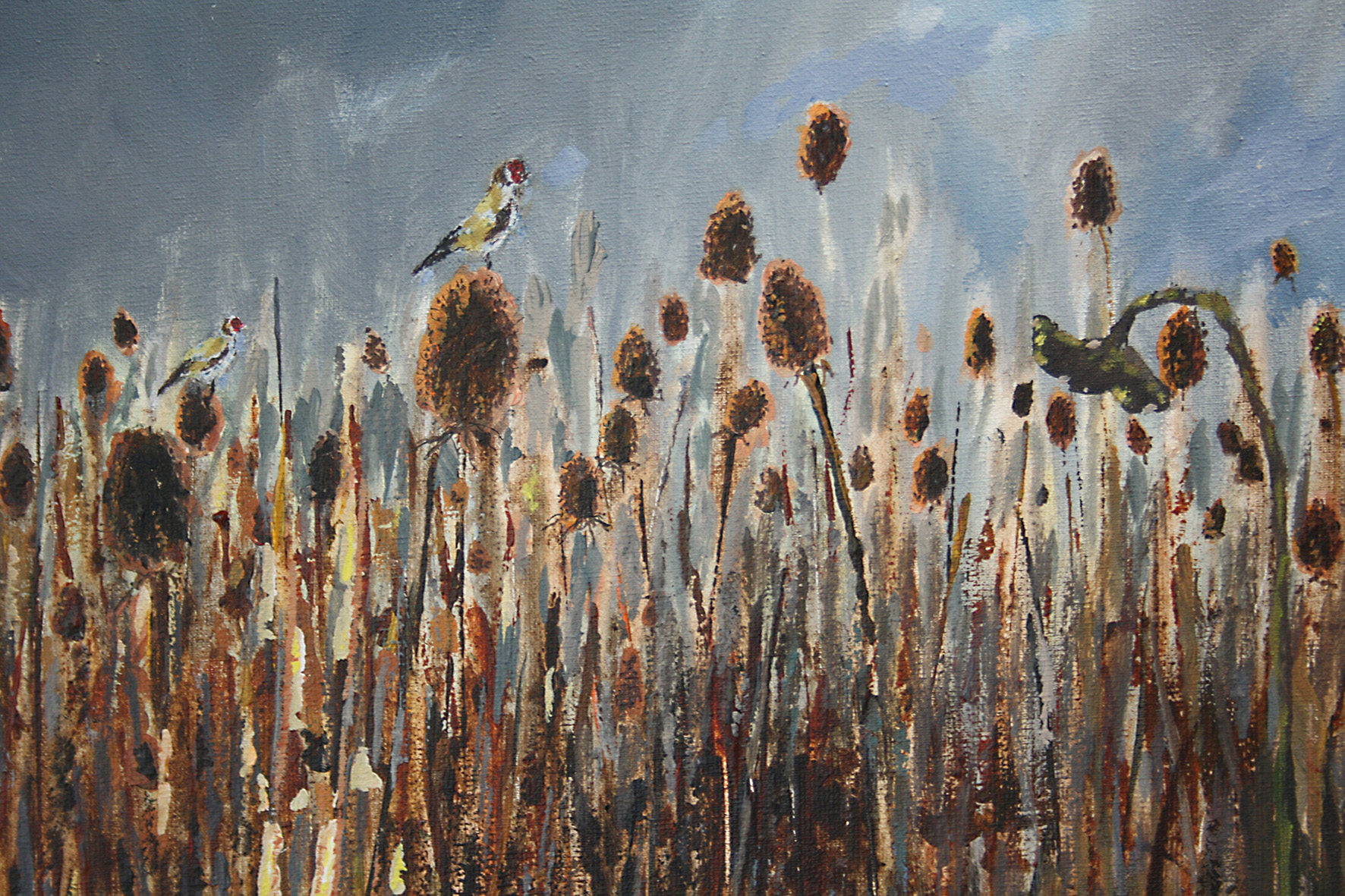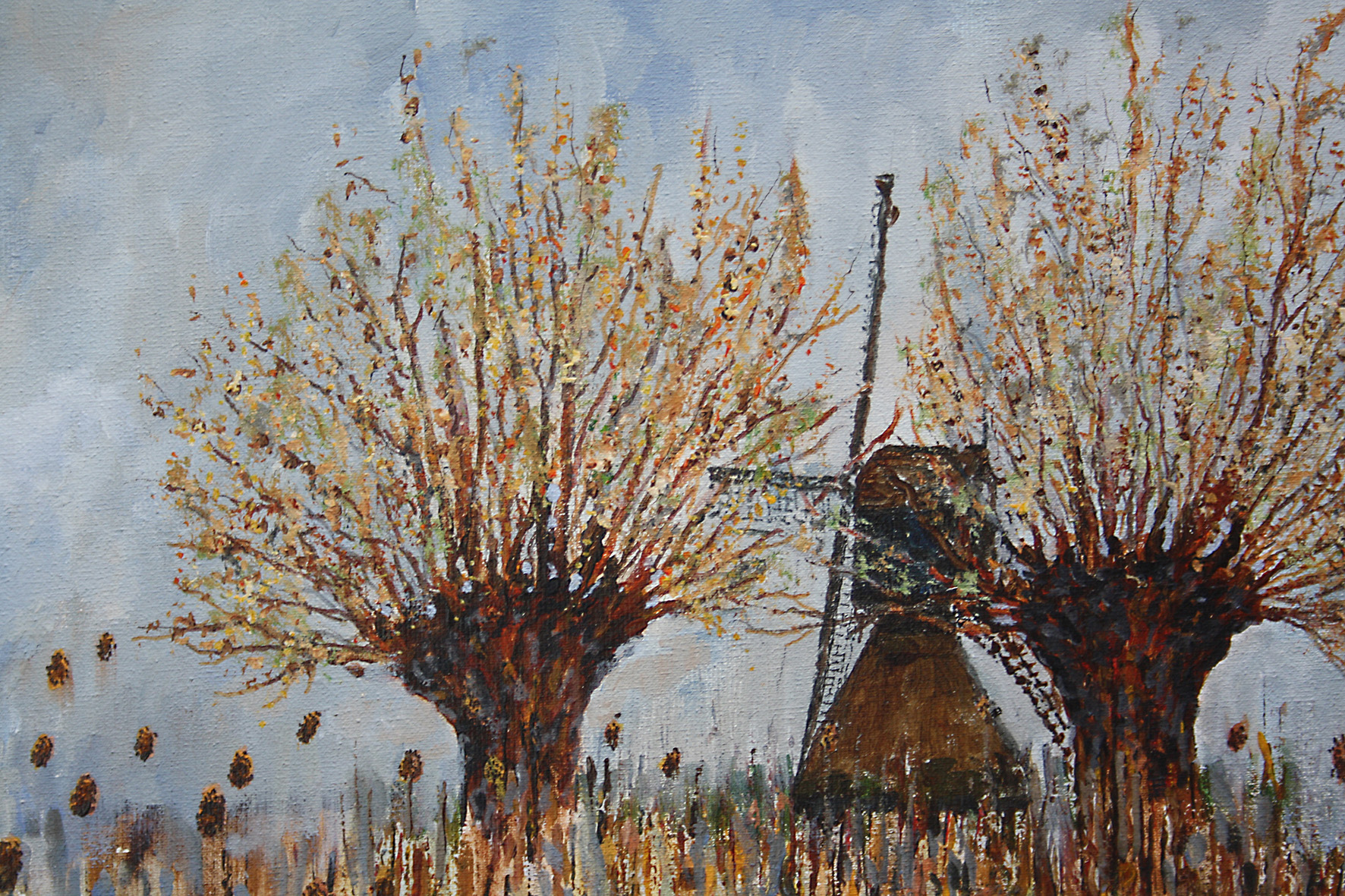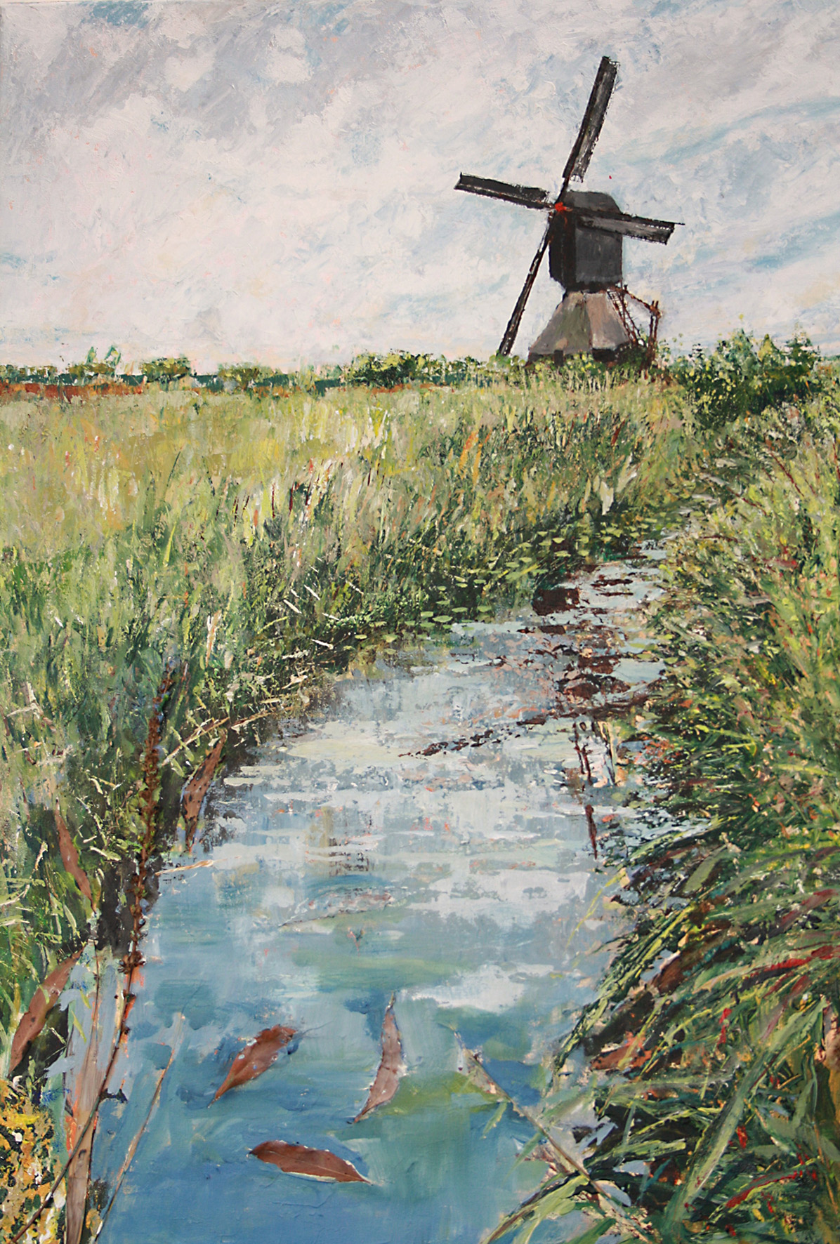 Kenmerkend is een ruige toets. Ik kras en gebruik ook b.v. planten om af te drukken of op een andere manier mijn doek te bewerken. Ik schilder niet precies, maar meer op een impressionistische wijze. Het geeft mij de vrijheid om op mijn wijze de natuur weer te geven.